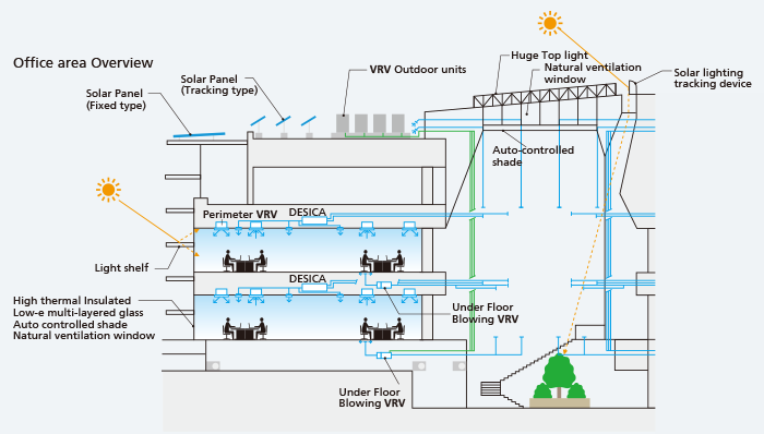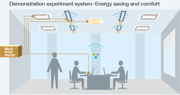 Demonstration experiment system adopted for further energy saving activities to achieve ZEB. Comfort and energy saving performance are evaluated by many sensors attached to the building. The analysis data is used for optimum control of not only air conditioning but also lighting, blind, and shades.